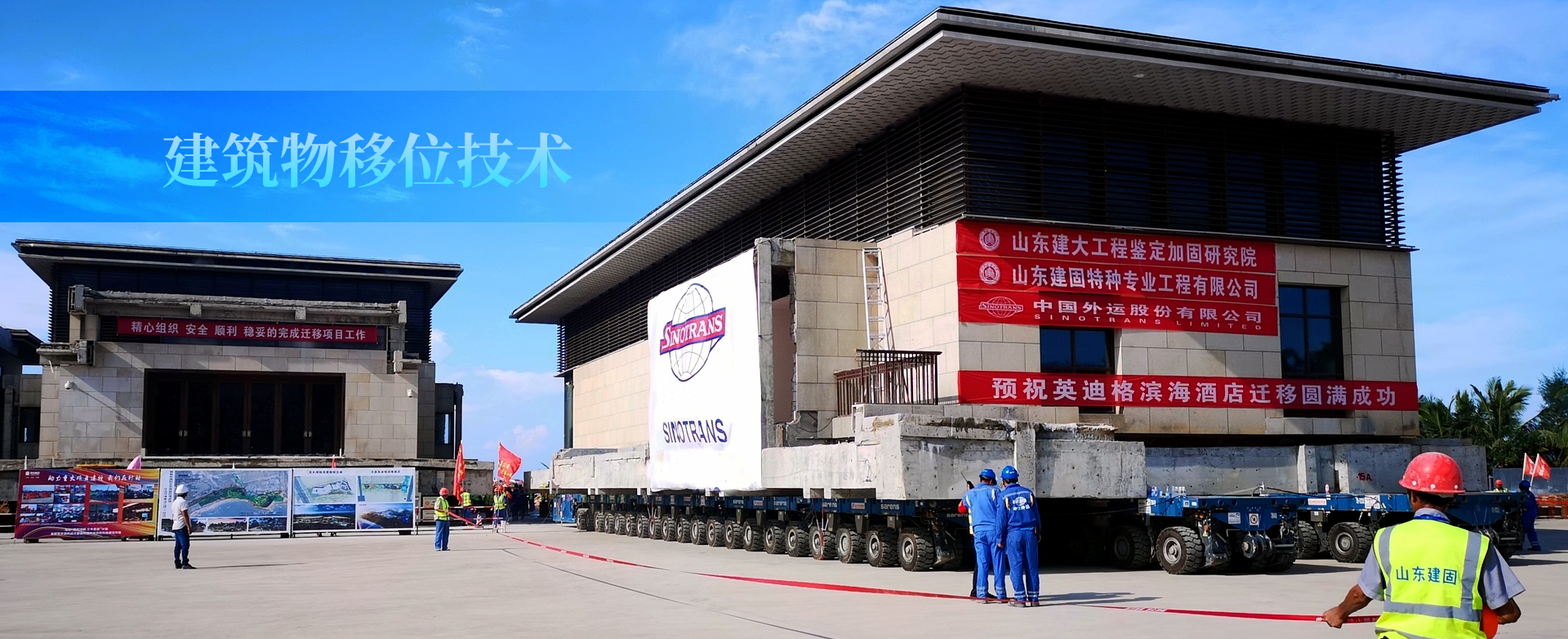 海南紅塘灣酒店為地下1層、地上2層鋼筋混凝土框架結(jié)構(gòu)。占地面積約2400㎡,總建筑面積4658㎡。遷移直線距離約500米,豎向頂升2.3米。紅塘灣酒店遷移工程的成功就位,標(biāo)志著一個(gè)新的記錄誕生:目前國(guó)內(nèi)外首例不規(guī)則扇形車輛布置、國(guó)內(nèi)拖車移位單體建筑面積最大(4658㎡)、國(guó)內(nèi)拖車移位單體建筑重量最重(7500噸)。山東建筑大學(xué)工程鑒定加固研究院、山東建固特種專業(yè)工程有限公司成立于1992年,三十年一直秉承“篤志疑難躬行求新”的企業(yè)精神,完成建筑物鑒定與加固改造、建筑移位、建筑糾傾項(xiàng)目六萬(wàn)余項(xiàng)。山東萊蕪高新區(qū)辦公樓平移項(xiàng)目,建筑面積24000㎡,重量35000噸,是國(guó)內(nèi)外最重平移工程;主持完成的